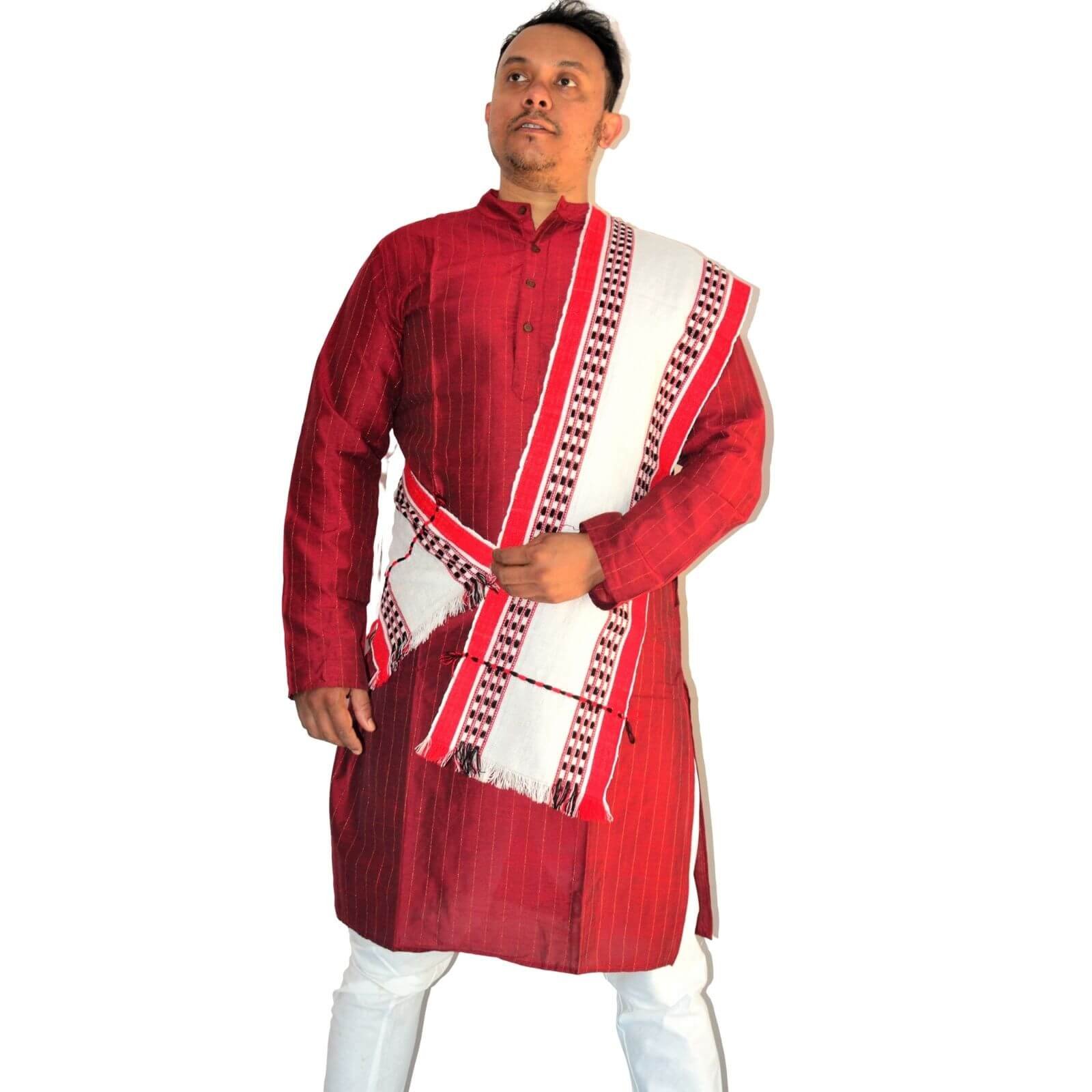 • This Manipuri traditional cloth, the Leirum Phee is commonly made from cotton fabric designed by using three colours; black, red proportionately designed on the larger white clothes, signifying the three guardians of the Universe.