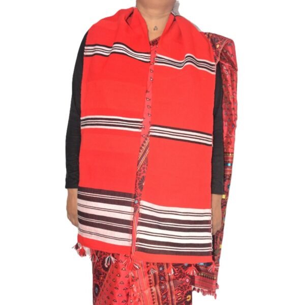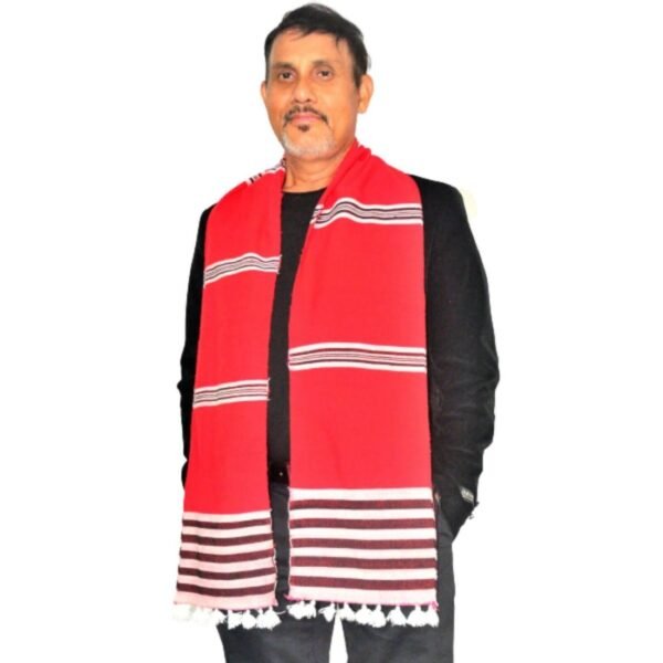 The Mishing tribe is one of the tribes that follows the code of dressing of Assam as a whole. Mishing Traditional Handwoven Muffler in cotton material. Very comfortable to wrap for both men and women. A traditional wear from the famous tribes of Assam called Mishing, it is also a souvenir given to elders during bihu celebration or respect in any occasion. Woven in red colour with cross stripes of different colours, such as black, white, etc.