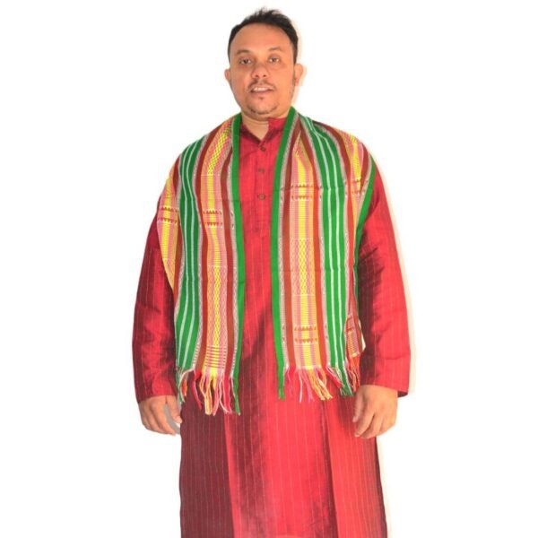 • Traditional Rabha Muffler or scarf – A colourfully woven shoulder scarf, which often hangs from the left shoulder scarf, which often hangs from the shoulder designed beautifully with different colours.