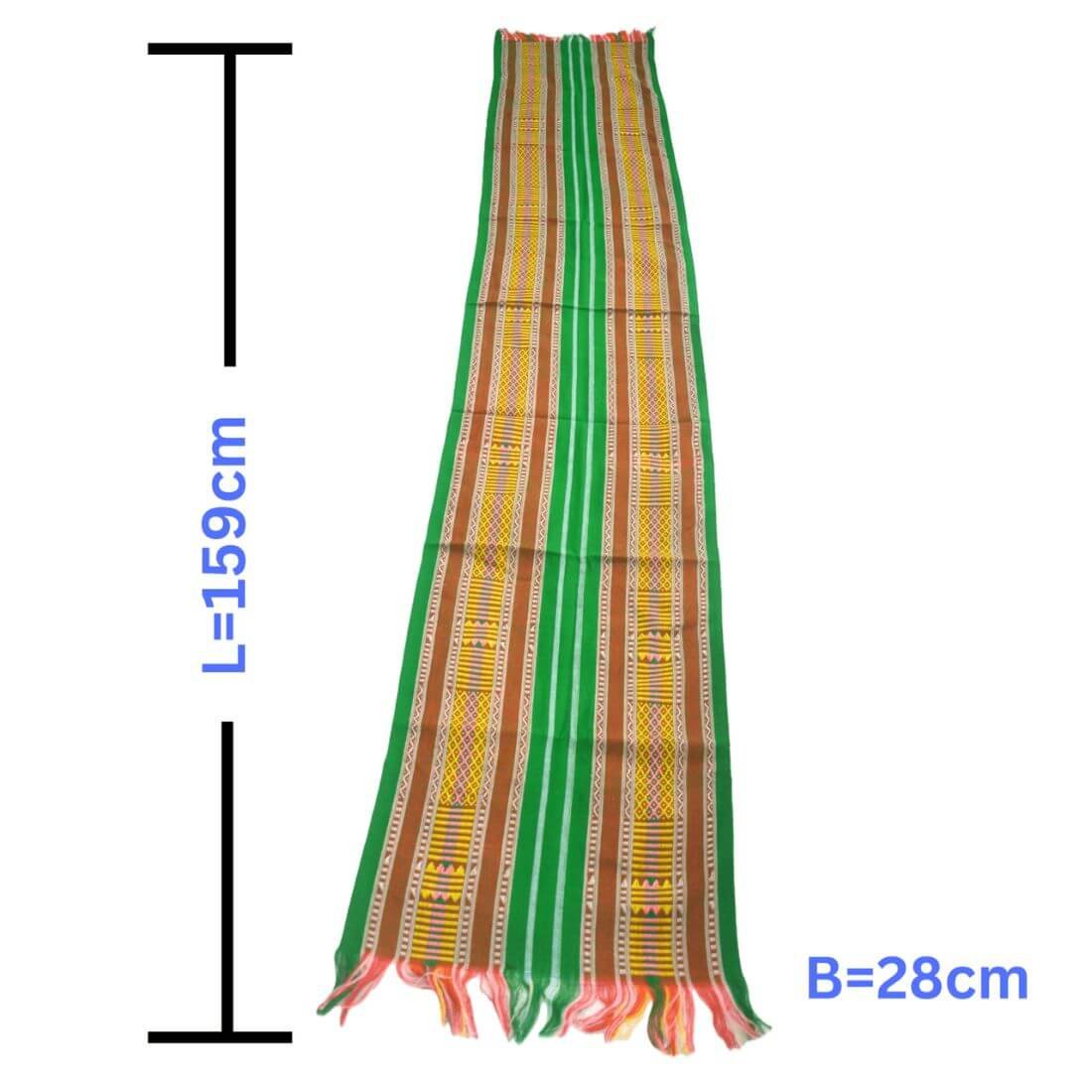 Rabha Traditional Muffler/Scraf/Stole/Scarves.Handwoven in Green colour with stripes/border of different multicolor. Size:LxB (159X28) cm.